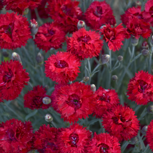 This colorful perennial produces fragrant, double, hot cherry red blossoms atop a low mound of silvery blue, spiky foliage. Use it to edge sunny borders and pathways. Grows best in full sun to light shade and loose, well-drained, neutral to slightly alkaline soil. Tolerates dry soil for short periods.