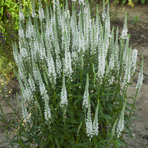 Pure white flower wands are born prolifically atop the short, dense clump of dark green foliage on this perennial. Try planting in combination containers or near the front of the border. This plant grows best in average, humus enriched, well-drained soil and full sun. Though it will survive in partial shade, it flowers best in the sun.