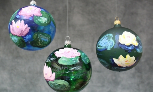 The centerpiece of this theme is an imported, hand painted European Monet-inspired ornament, designed by English Gardens and found exclusively at our stores and the Museum gift shop. Available in three different colors, each features exquisitely painted water lilies.
