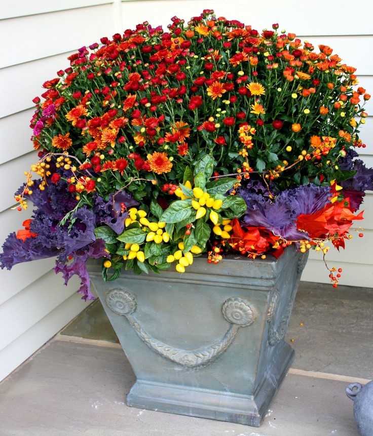 Pumpkins in various colors and sizes make a beautiful fall decoration when piled in a planter or placed along the steps of your porch. You can also cut the top of a pumpkin off and place mums inside. If your planter is too big for your pumpkins, use a block of florist’s foam to lift pumpkins and gourds into view.