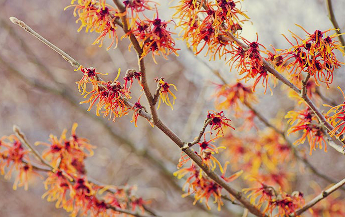 Another late winter-blooming plant is Witch hazel. Its showy flowers bloom in late winter/early spring with a nice spicy fragrance. This flowering shrubs has many season of interest. Its fall color is especially appealing with a leaves that turn a nice coppery/burgundy color.