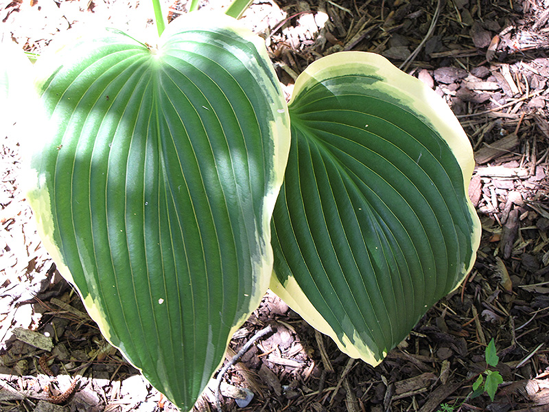 A dark green leaf center with narrow creamy margins; leaf is a rounded heart shape and lightly corrugated when mature; spikes of lavender flowers in mid-summer; a beautiful addition to the garden or border.