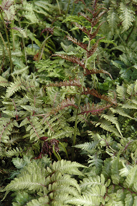 There are several Painted Ferns and they all share the silvery foliage with burgundy highlights. Some are short like the Pictum Fern, while others get up to three feet tall, like Godzilla. Painted Ferns add a grace and delicacy to the garden.