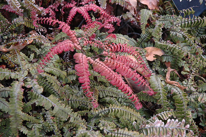 This interesting crinkled fern creates a beautiful effect when massed with new growth emerging reddish-brown, later becoming green; this fern will remain evergreen in zone 7 and up and winter deciduous from 6b down to 5. Rough Maidenhair Fern’s crinkled ferny compound leaves emerge brick red in spring, turning grayish green in color. As an added bonus, the foliage turns a gorgeous yellow in the fall.