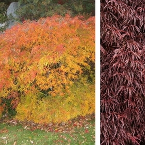 Crimson Queen: A dwarf, rounded tree with a weeping branch habit that adds fine, graceful texture to your garden. The highly dissected foliage emerges purple in the spring and develops to spectacular shades of red and orange in the fall. It grows 8 to 10 feet tall and spreads 10 to 12 feet wide. Plant in full sun to part shade.