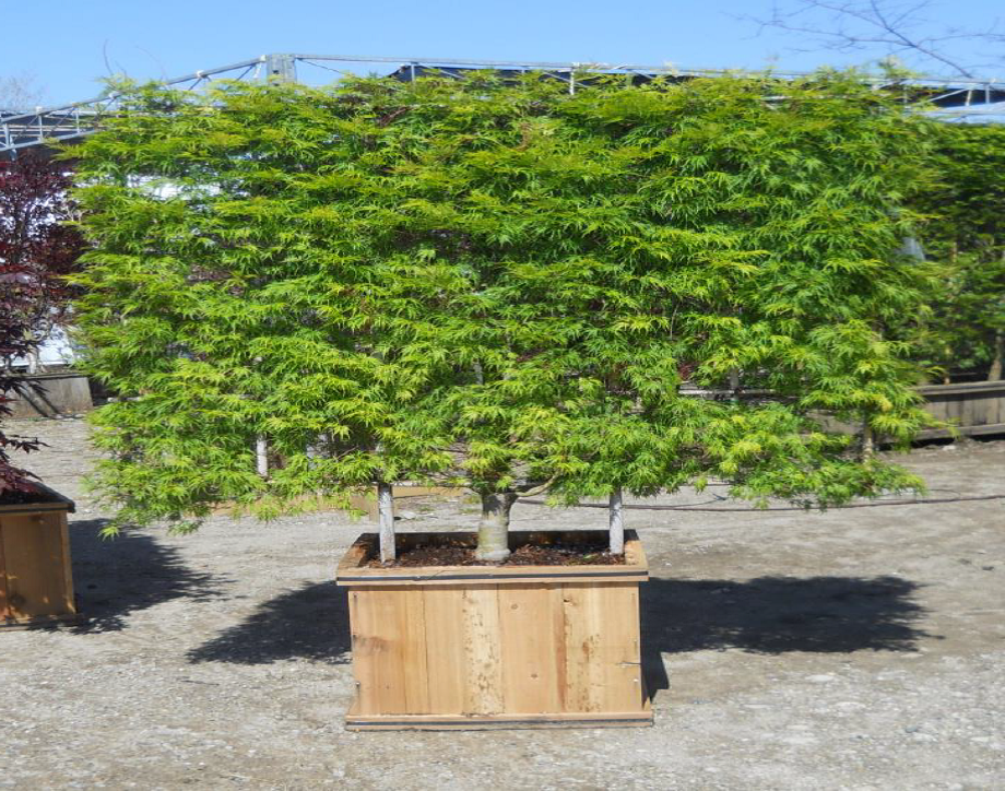 Japanese Maple Screens are a great way to incorporate summer color and texture into the borders of your yard and outdoor rooms. Lace-leaf weeping (Acer palmatum ‘Bloodgood’ or (Acer palmatum ‘Seiryu’) and palm-leaf upright (Acer palmatum ‘Katsura’) Japanese Maples are trained to provide dense maroon or green barriers available in either five foot or seven foot sections that create private spaces in your yard.