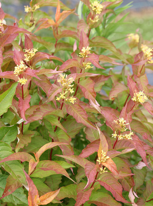 This shrub pushes fall color to the limits with its glowing orange fall foliage. It lights up the autumn landscape, making it an eco-friendly alternative to burning bush. Bright yellow flowers in early summer add to its appeal. A durable native plant that thrives in sun or shade, its is drought-tolerant, deer-resistant, and can even grow in dry shade.