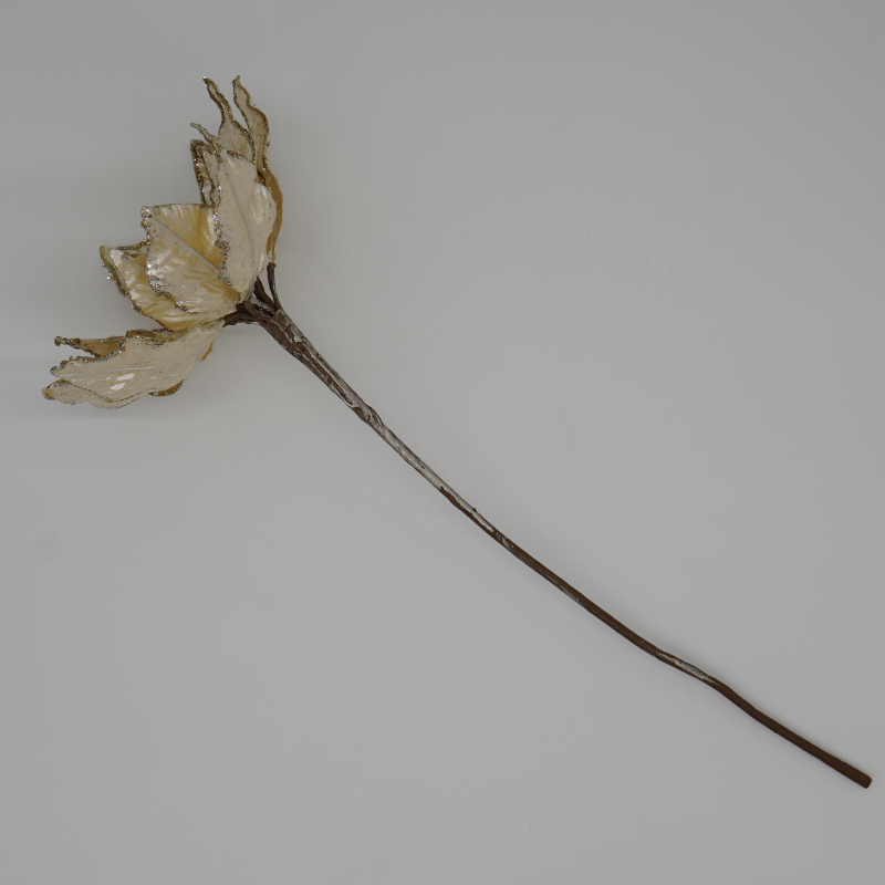 For an elegant and glowing look, add this shiny pearl poinsettia stem with gold glitter edging.
