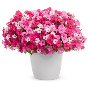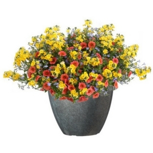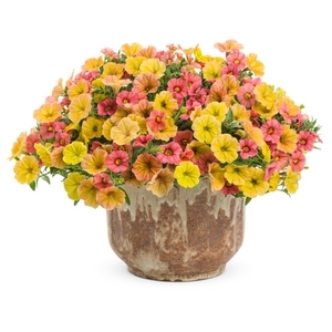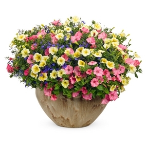 Create two of these intriguing containers to place at your front entrance. The striking, pink Superbell is balanced by the orange-yellow Supertunia.
