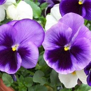 Pansies add color and interest to any container garden. Available in a wide range of colors including purple, white, yellow and orange. They require steady moisture and partial sun. Also, Pansies are edible!