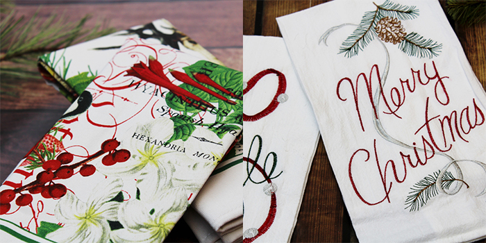 Beautiful Holiday inspired linens for your kitchen and bathroom.