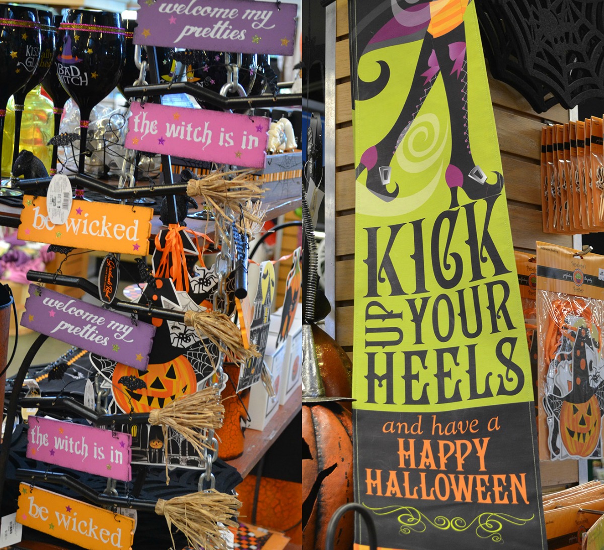 “welcome my pretties,” “the witch is in,” “be wicked” broomstick signs