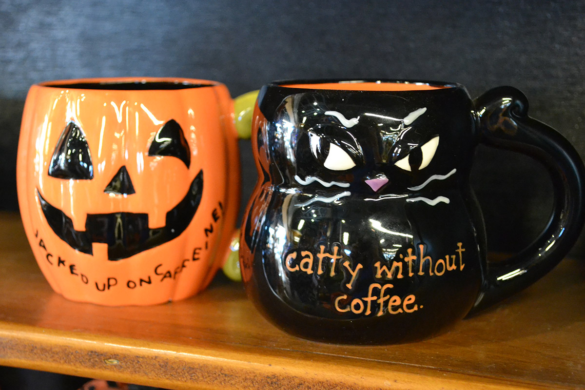 “Jacked up on caffeine” Jack-O-Lantern mug and “Catty without coffee” Black Cat mug.