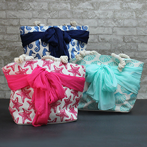 These brightly colored beach bags features sarongs that double as a cover-up. They’re fashionable and functional.